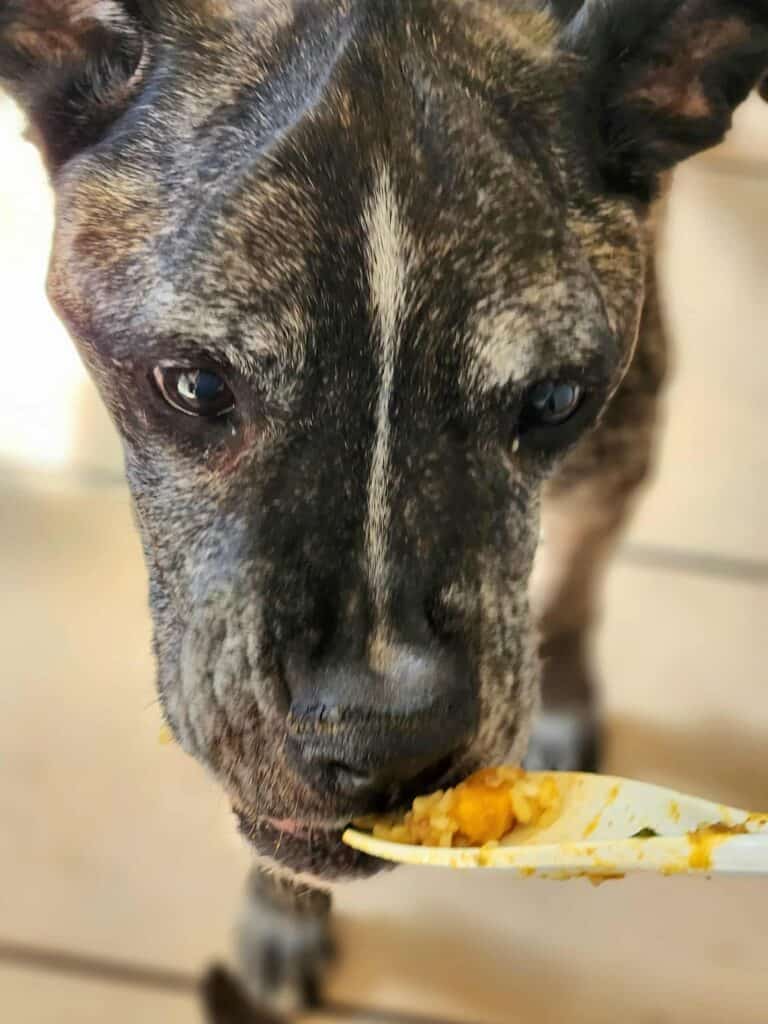 This recipe was made for my Haley .. my 15-year-old Boxer Mastiff who sometimes forgets why she walked into a room but will never forget where the food bowl lives. After one rough week of tummy troubles, I whipped this up for her… and let’s just say she had it for breakfast, lunch, and dinner until the pot was gone. By the next morning, the poop fairy had blessed us again .. all was right in the world.