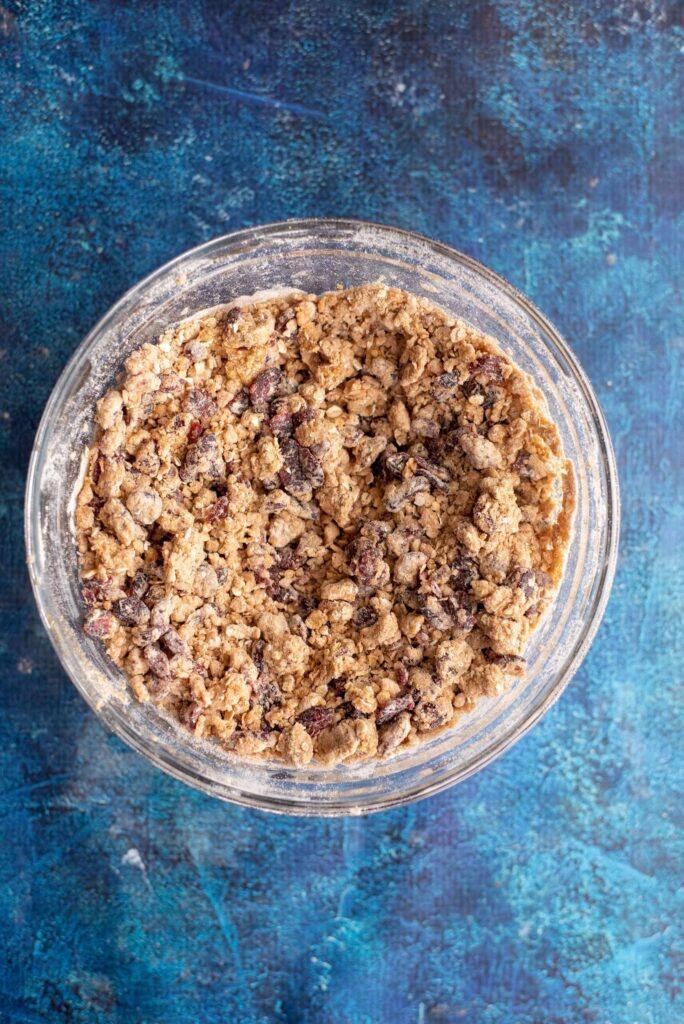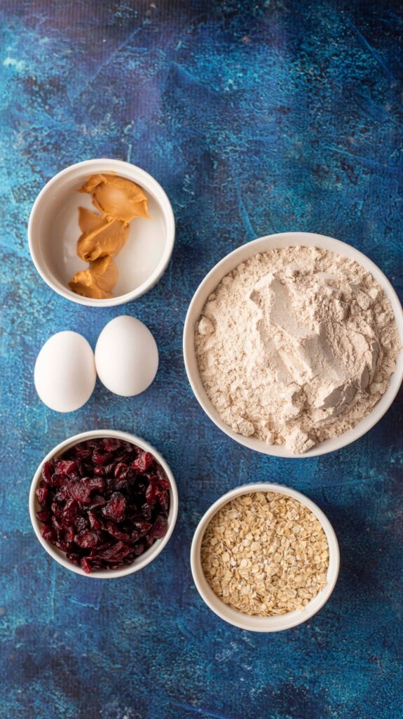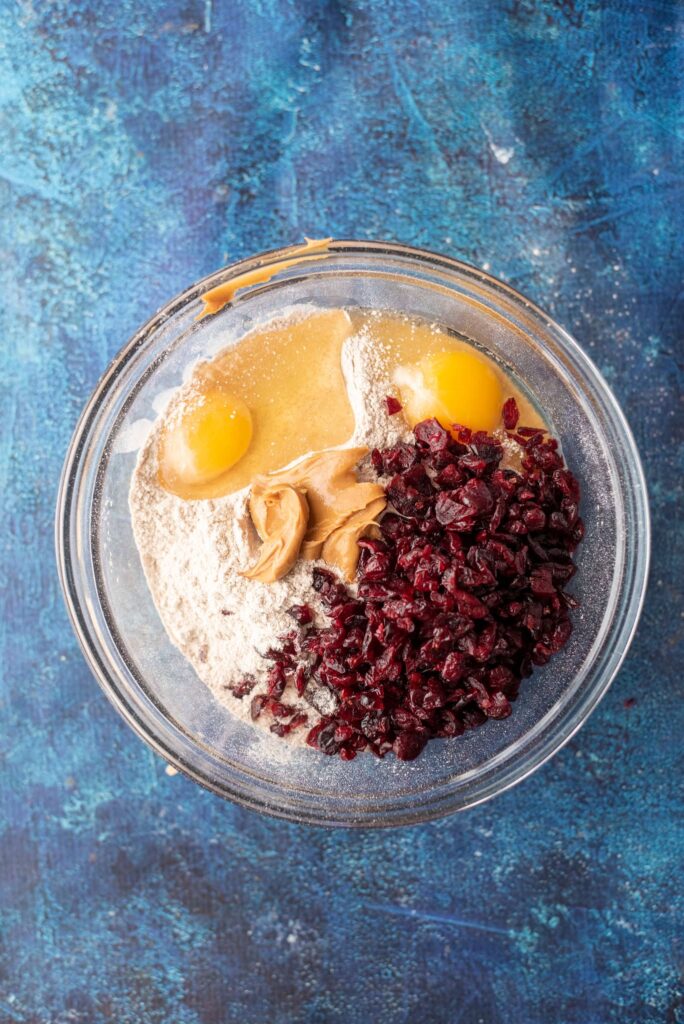 - Prepare the oats: In a large mixing bowl, combine the rolled oats, wheat flour, chopped cranberries, eggs and peanut butter. Mix them together until well combined.