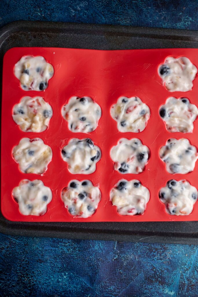 - Using a large spoon, fill in your molds evenly with the yogurt mixture. Move your mold to a small baking sheet and then transfer the whole thing to your freezer. Freeze your doggie fruit cups for minimum 5 hours but overnight is better.