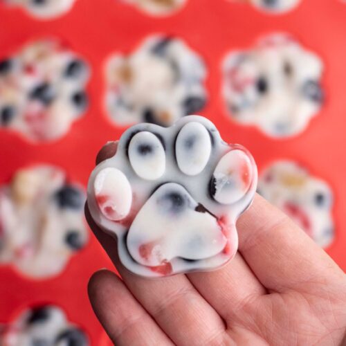 When it comes to homemade frozen dog treats, these icy yogurt berry paw prints are my favorite way to serve up a snack to my pups poolside.