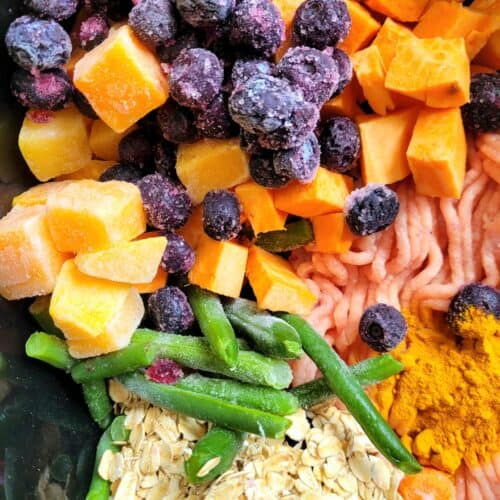 Whip up this slow cooker harvest dog food recipe with ground turkey, sweet potato, blueberries, frozen veggies, green beans & oats. A DIY fall-inspired homemade dog food that’s healthy, freezer-friendly, and perfect for senior pups too!